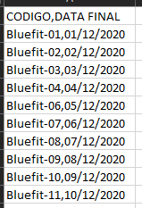 Upload de códigos - Importar arquivo: após criar os códigos, é necessário importar eles com a data de validade. Ah, e pode ficar tranquilo, a data não irá aparecer para o usuário que resgatar o código. Ex.: bluefit-01,01/12/2023.