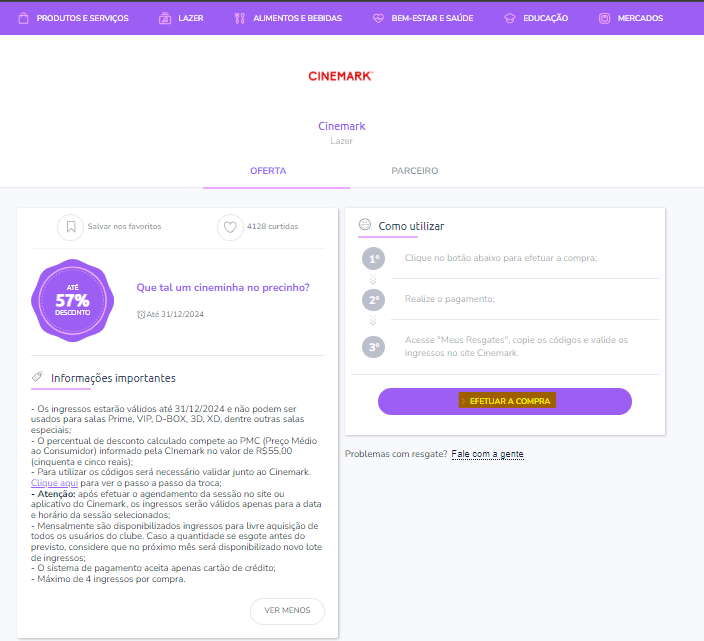 Para adquirir o ingresso, basta acessar a oferta do Cinemark e selecionar a quantidade desejada e clicar em continuar. (Reforçamos que a quantidade está limitada a 4 ingressos por CPF/compra).