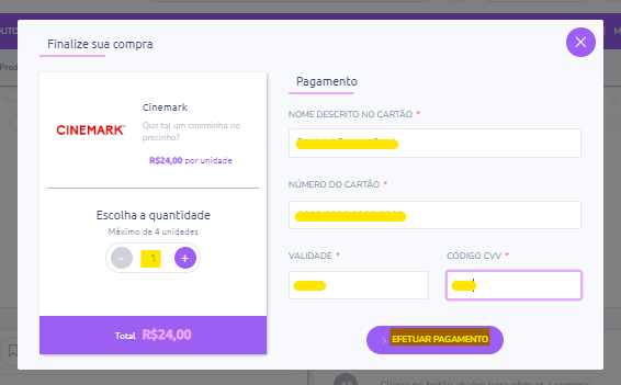 Selecione a quantidade de ingressos, preencha os dados do cartão e finalize clicando em 'Efetuar Pagamento'.
